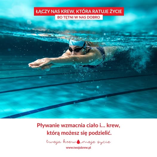 Pływanie wzmacnia ciało i… krew, którą możesz się podzielić. Odciąża stawy i poprawia kondycję, Wzmacnia serce, Buduje odporność, poprawia wydolność oddechową, daje spokój i endorfiny. Każda długość basenu to inwestycja w Twoje zdrowie – a zdrowe ciało to zdrowa krew. Krew, która może uratować życie pacjentowi, wymagającemu leczenia krwią lub jej składnikami. Twoja energia może