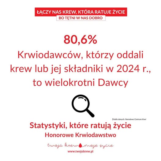 80,6% Krwiodawców, którzy w 2024 r. oddali krew lub jej składniki to dawcy wielokrotni. To nie jednorazowy gest. To świadoma decyzja, powtarzana regularnie oraz budowanie potrzeby regularnego pomagania pacjentom wymagającym leczenia krwią lub jej składnikami. Dzięki Krwiodawcom zapewniana jest stabilność systemu krwiodawstwa i krwiolecznictwa. To właśnie Honorowi Dawcy Krwi są filarem krwiodawstwa i krwiolecznictwa. Może